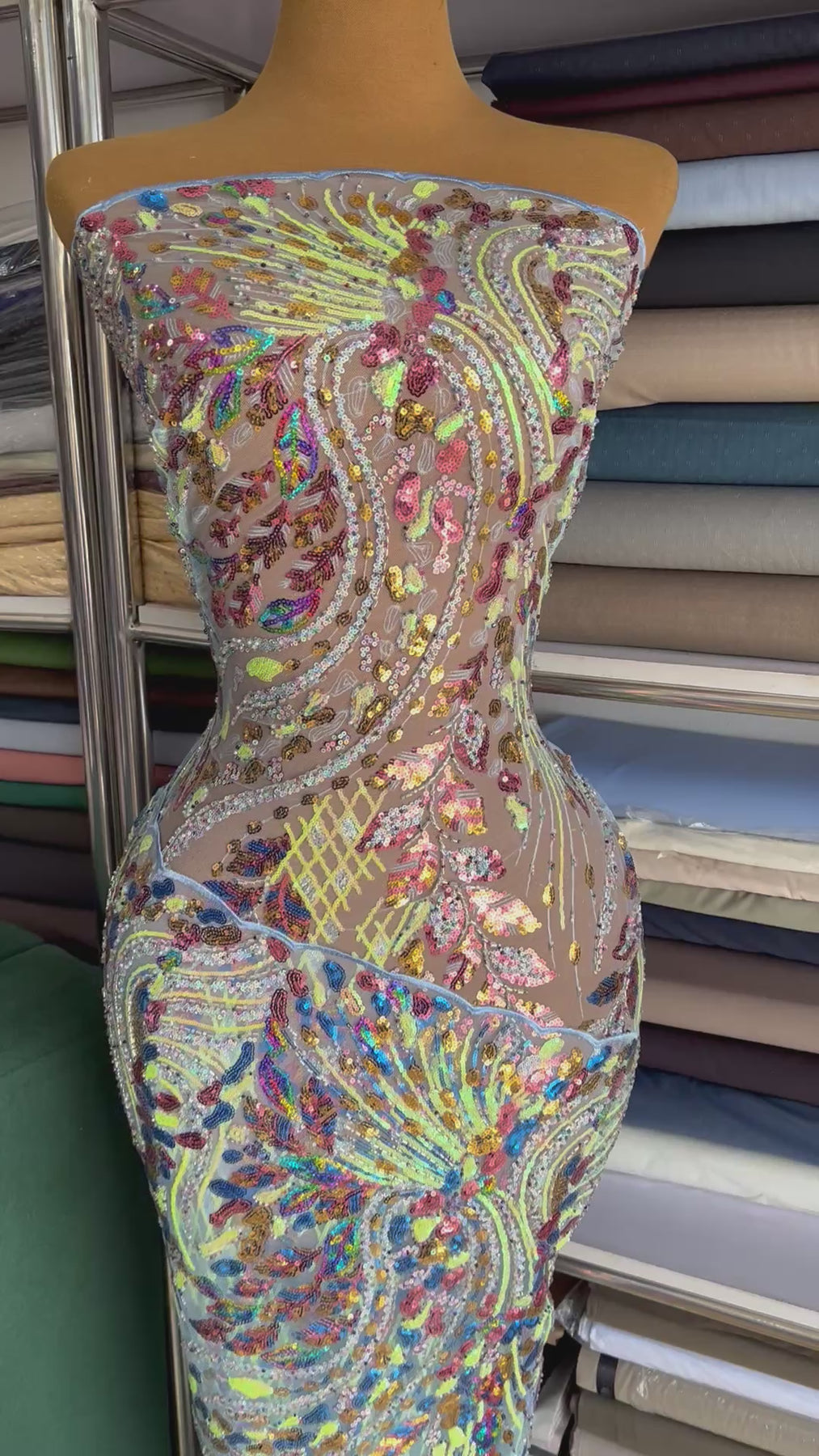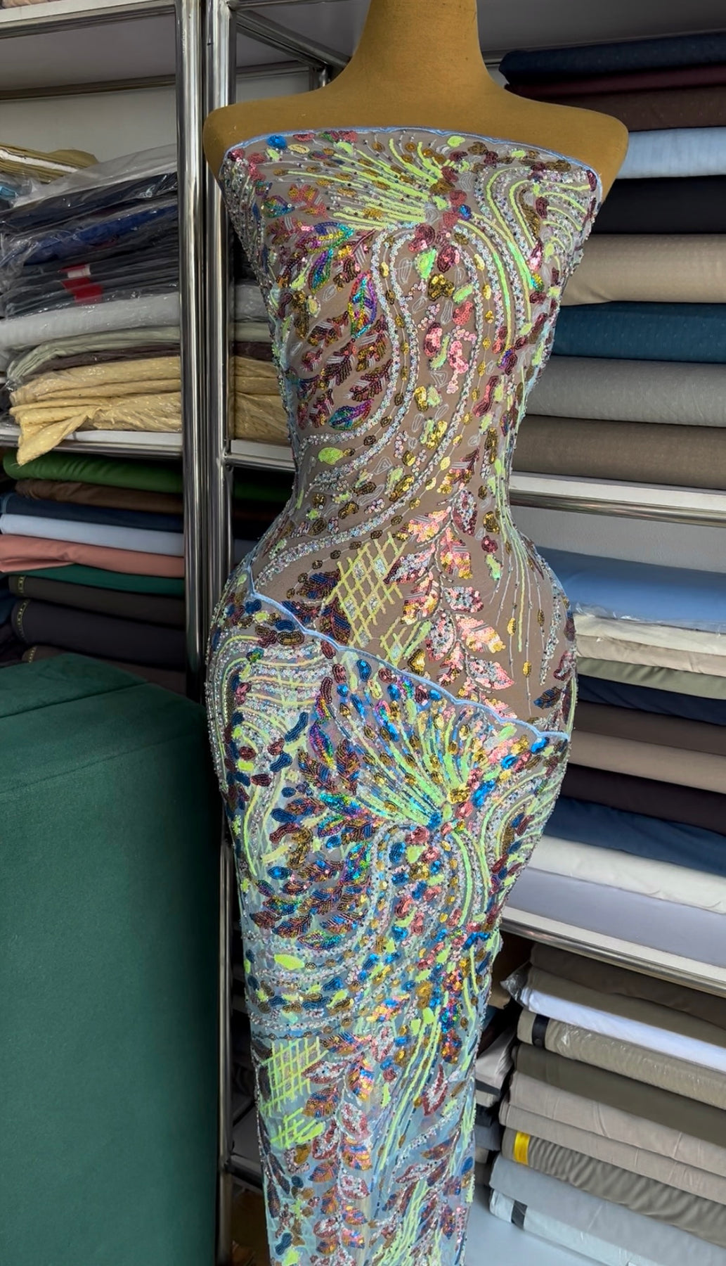 Sky blue, lemon, royal blue and pink. Multintone occasional fabric