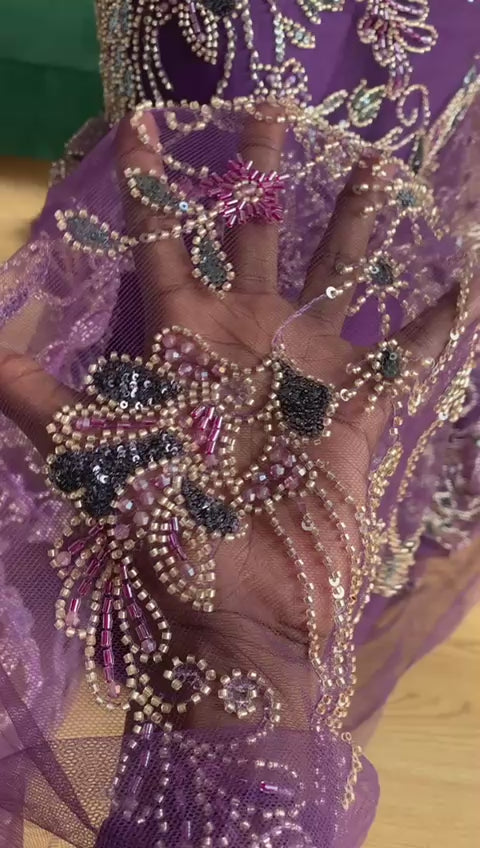 Multi toned premium immaculately crafted piece. Gold and purple beads woven into intricate floral pattern on a purple base.