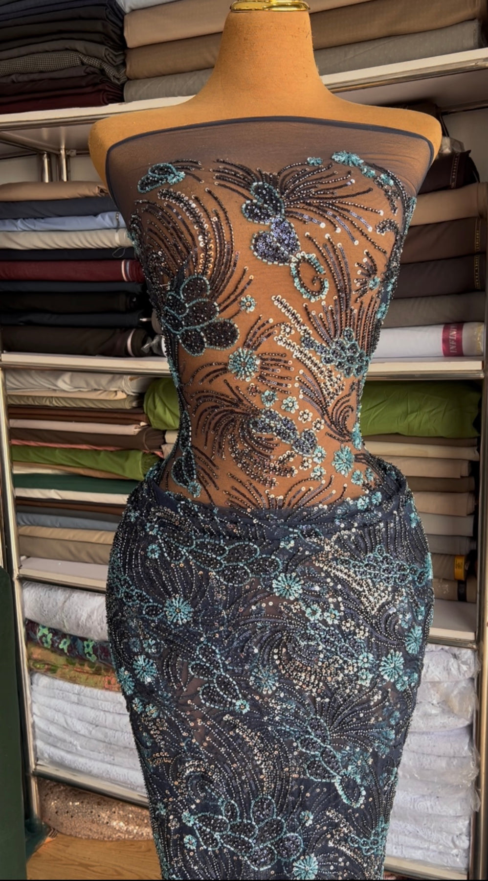 Navy and teal blue. Beautifully beaded luxury lace.