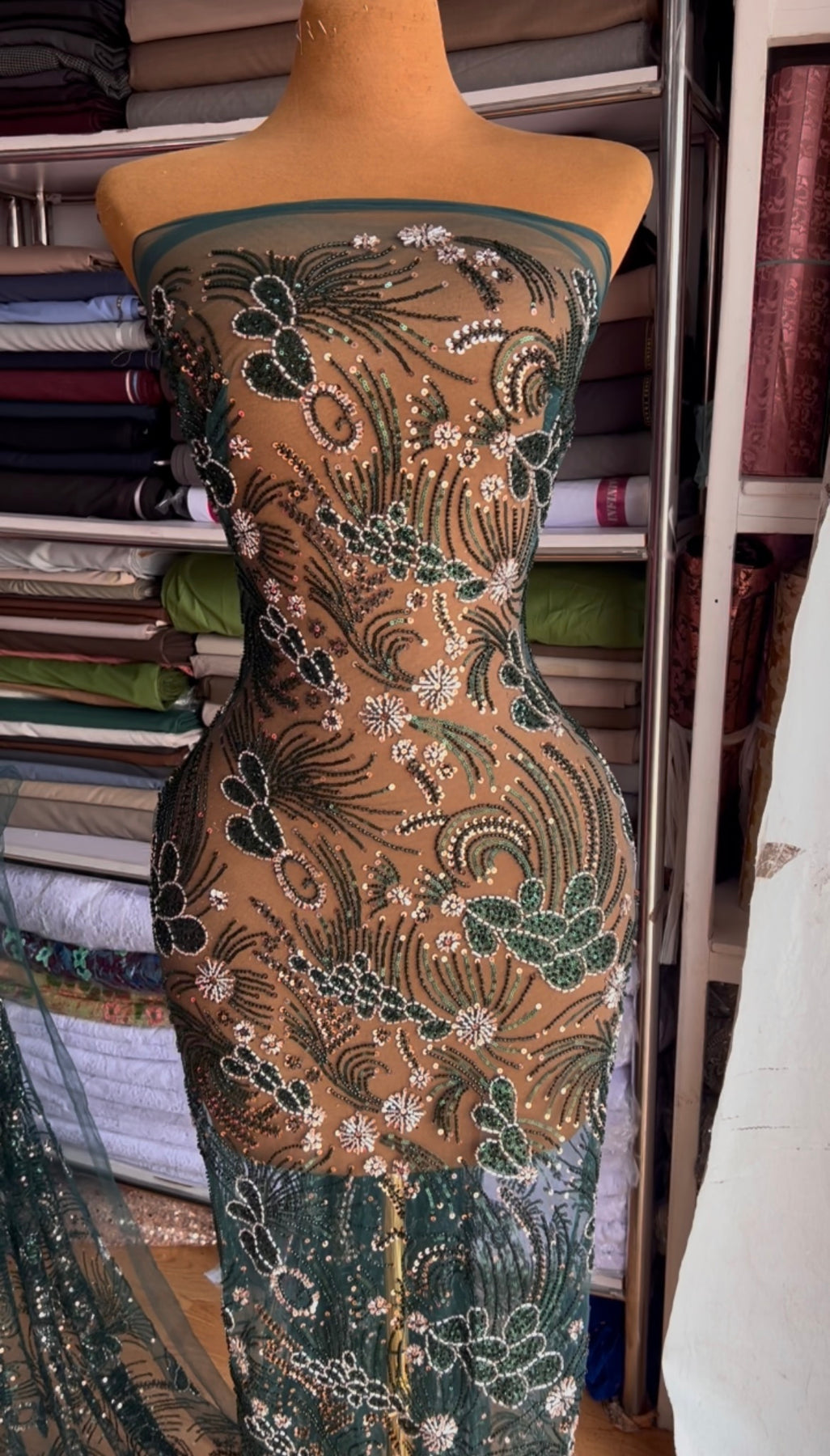 Emetals green and ivory. Beautifully beaded luxury lace.